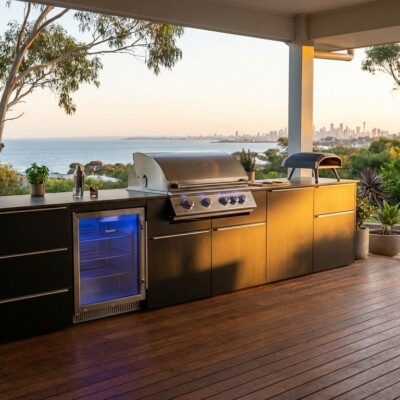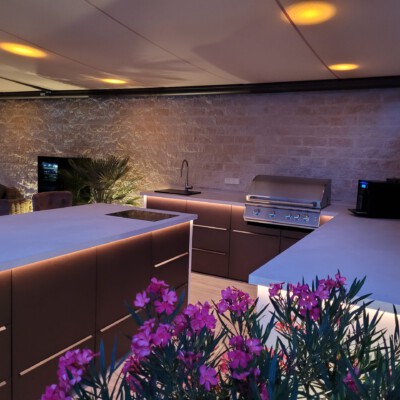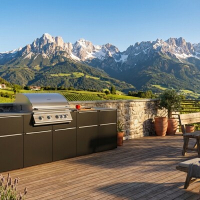 Durch eine ausreichende Korpustiefe ist das Aufstellen der Outdoorküche an einer Wand problemlos möglich, so dass auch Grills mit ausladendem Deckel problemlos geöffnet werden können. Dabei sind sogar leichte Unebenheiten an der Wand oder herausstehende Installationen meist kein Problem. Durch die nach innen versetzten Rückwände, aber auch die Stirnblenden besteht etwas “Spiel” um solche Herausforderungen zu kompensieren.