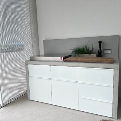 Die Arbeitsplatte ist von hochindividuellen Faktoren abhängig. Ob Materialwahl, gewünschte Stärke, benötige Ausschnitte, Plattenüberstände, Abtropfkante, Aufkantungen, individuell gegossen, Übergänge zu Stützpfeilern, Stollen im Gehrungsschnitt, Stoßkanten, Klebepunkte uvm.