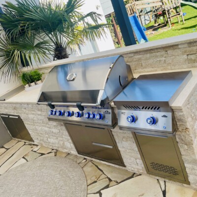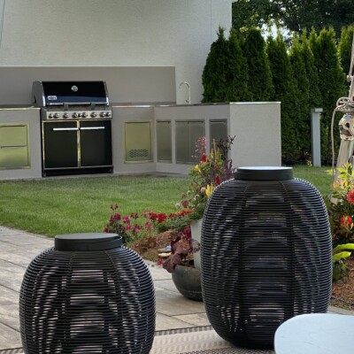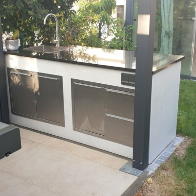 Ähnlichen wie bei einem kompletten Individualbau kannst du deine Outdoor-Küche genau nach deinen Bedürfnissen und Wünschen gestalten. Vom Layout und der Größe bis hin zu den Materialien und dem Design – du hast die volle Kontrolle über jedes Detail. Ob eine Außenküche in mediterraner Bruchsteinoptik, roter Klinkerstein, puristische klare Schiefer Optik oder auch einfach nur im Bauhausstil weiß verputzt. Bei der Wahl der Oberflächen deiner Außenküche sind kaum Grenzen gesetzt, so dass sich die Küche perfekt nach deinem Geschmack in den Garten oder die Terrasse einfügen lässt.