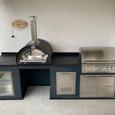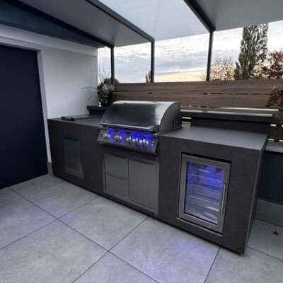 Bei dieser Outdoor Küche in Betonoptik wurde das vivandio custom-System mit Einbaukomponenten wie Edelstahltüren sowie verschiedenen Geräten wie Kühlschrank und Gasgrill kombiniert.