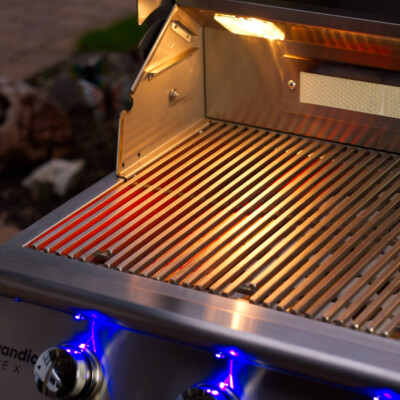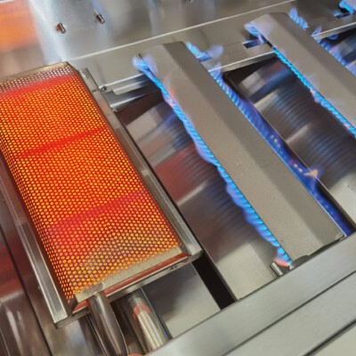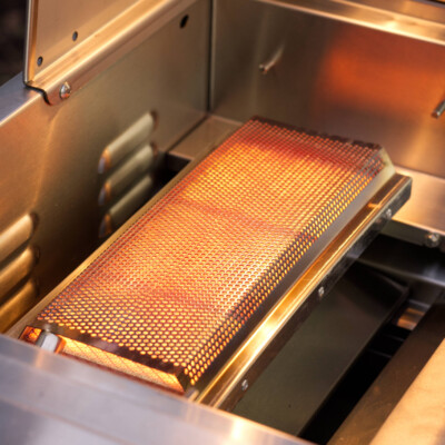 Da die Vorteile der Keramikflammenabweiser mit einer gewissen Latenzzeit daherkommen, bieten wir zusätzlich Edelstahl Flammenabweiser an. Hierbei setzen wir nicht auf einfache V Bleche über den Brennern, sondern ebenfalls auf eine vollflächige Umsetzung um eine möglichst gleichmäßige Temperaturverteilung zu erzielen. Da diese Art von Flammenabweiser mehr auf Konvektions- und weniger auf Strahlungshitze setzt und Gasgrills im hinteren Bereich tendenziell mehr Hitze haben (konstruktiv bedingte Stauhitze, aber auch mehr Gasaustritt am Zündkanal der Brenner), sind unsere Metallflammenabweiser etwas von vorne nach hinten gesenkt verbaut um die (Konvektions)Hitze etwas nach vorne zu führen. Darüber hinaus verfügen die Metallflammenabweiser über ein spezielles Lochmuster zur möglichst gleichmäßigen Hitzeverteilung.