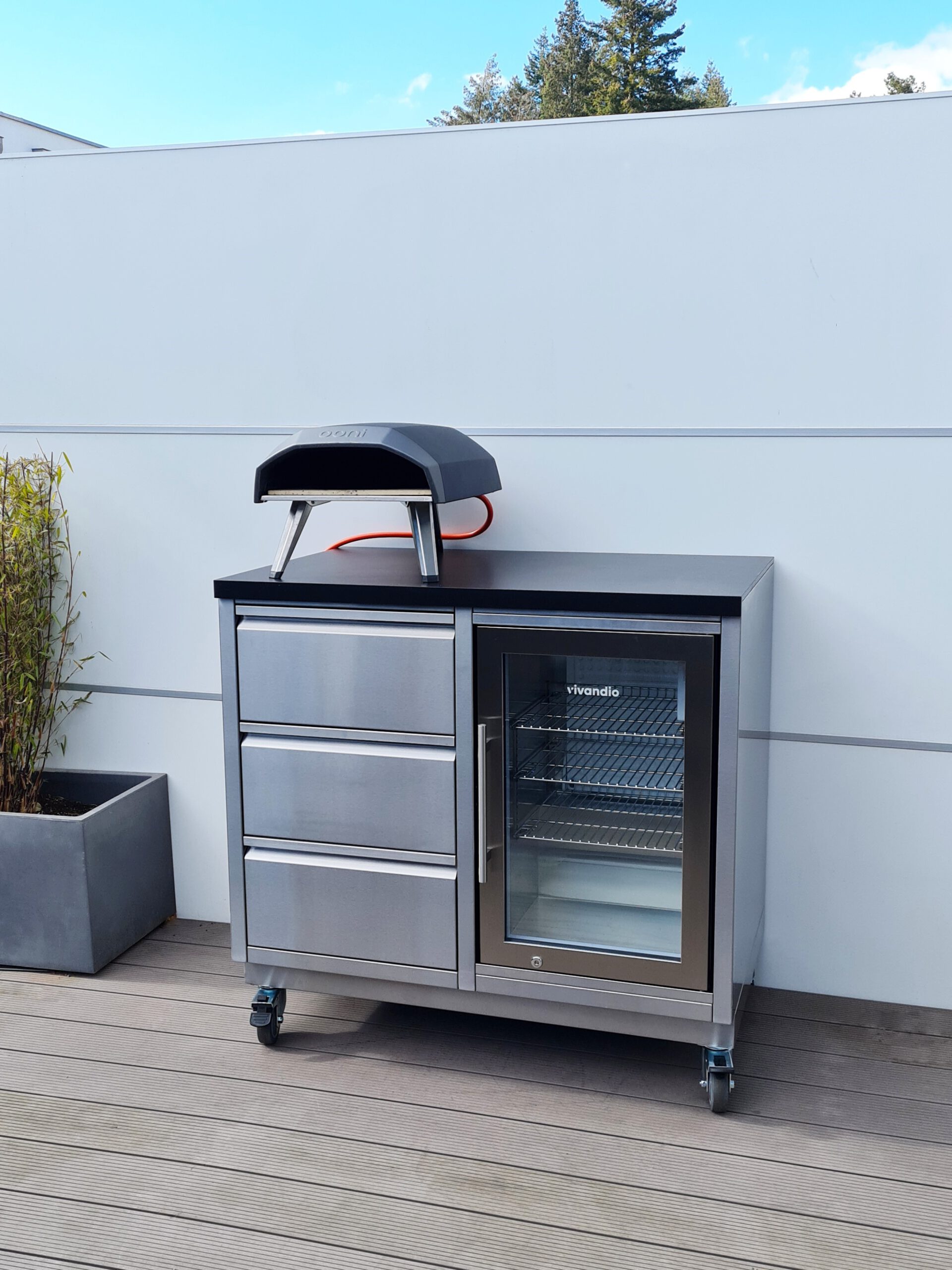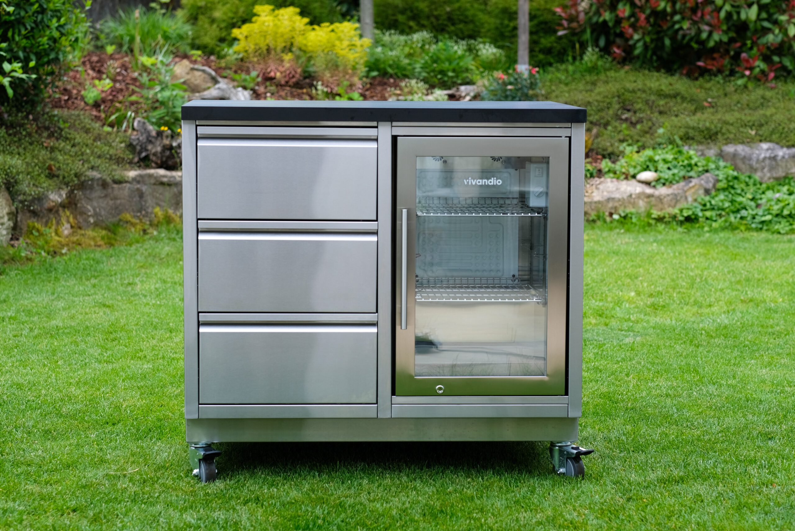 - Outdoor Küchenkorpus aus Edelstahl in gebürsteter Ausführung bzw. mit witterungsbeständiger Pulverbeschichtung.