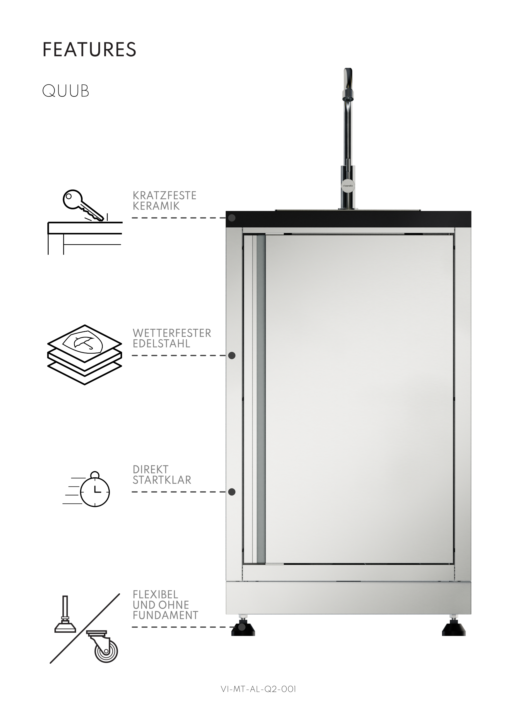 - Outdoor Küchenkorpus aus Edelstahl in gebürsteter Ausführung bzw. mit witterungsbeständiger Pulverbeschichtung.